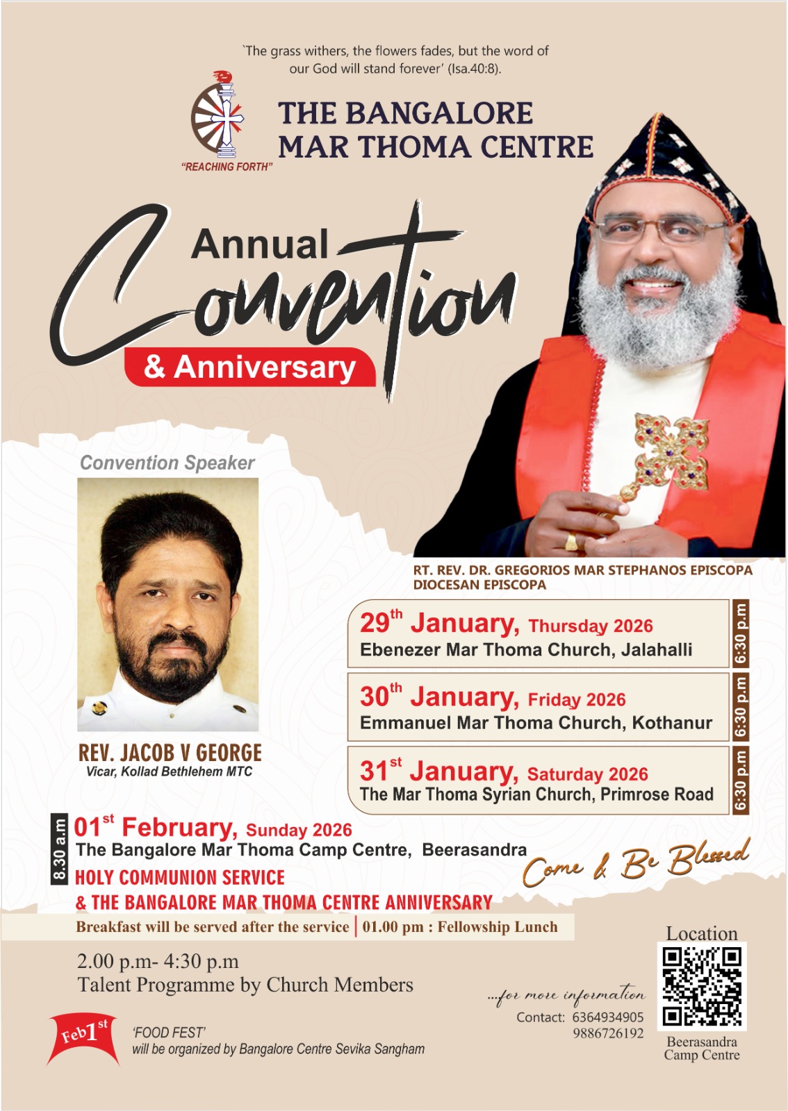 The Chennai Bangalore Diocese is one of the thirteen Dioceses of the Malankara Mar Thoma Syrian Church which is spread across four states of Tamil Nadu, Karnataka, Andhra Pradesh and Telengana and the Union Territories of Andaman and Nicobar Islands and Pondicherry in India and St. Thomas Mar Thoma Church and St. James Mar Thoma Church in Kuwait. It is also called a Missionary Diocese as mission fields constitute half of the parishes of the Diocese. The Chennai Bangalore Diocese is divided into ten centers, with.